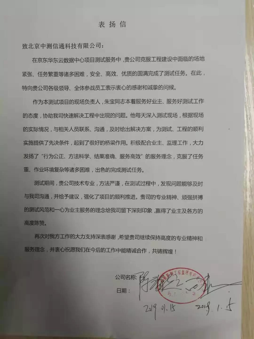 此次測試工作圓滿完成,業(yè)主方贊不絕口,并提出書面表揚!
