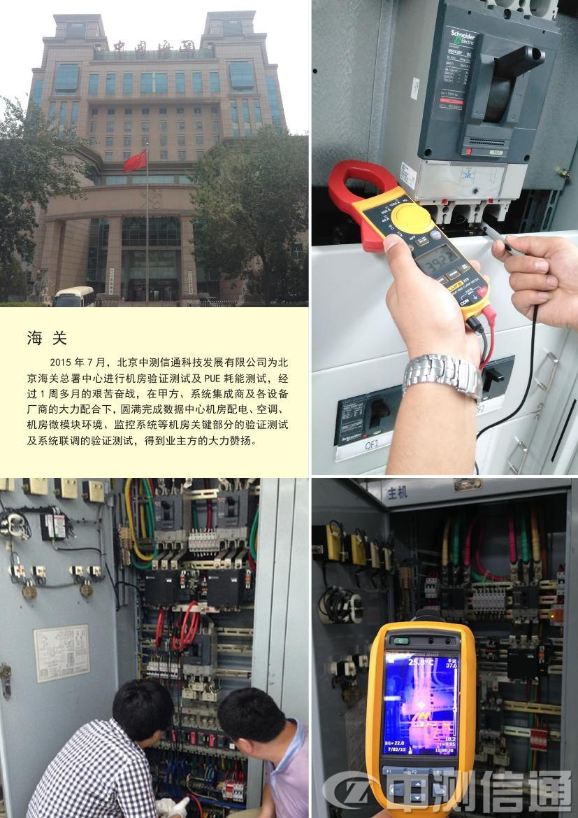2015年7月,北京中測信通科技發(fā)展有限公司為北京海關(guān)總署中心進行機房驗證測試及PUE耗能測試,經(jīng)過1個多月的艱苦奮戰(zhàn),在甲方、系統(tǒng)集成商及各設(shè)備廠商的大力配合下,圓滿完成數(shù)據(jù)中心機房配電、空調(diào)、機房微模塊環(huán)境、監(jiān)控系統(tǒng)等機房關(guān)鍵部分的驗證測試及系統(tǒng)聯(lián)調(diào)的驗證測試,得到業(yè)主方的大力贊揚。