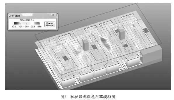 雖然熱通道平均溫度只有25℃,但是部分區(qū)域如D列熱通道會出現(xiàn)熱點,溫度超過35℃左右。而對于低功耗3、4號冷通道,冷量超過需求,機房內(nèi)冷熱資源分布不均造成浪費。圖1給出了機柜頂部溫度圖3D模擬圖。