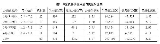 通過將地板出風(fēng)口處的風(fēng)速參數(shù)輸入到CFD軟件中,模擬出冷通道內(nèi)風(fēng)量供需比分布圖。改造前的能耗較大的2個冷通道(1號和2號冷通道),風(fēng)量供應(yīng)較低;而對于低功耗的3號和4號冷通道,風(fēng)量供應(yīng)較大。R區(qū)機房10臺空調(diào)全開的額定最大送風(fēng)風(fēng)量為242,000CMH,實際模擬和分析所需風(fēng)量僅為102,279CMH,供應(yīng)風(fēng)量遠大于實際所需風(fēng)量。