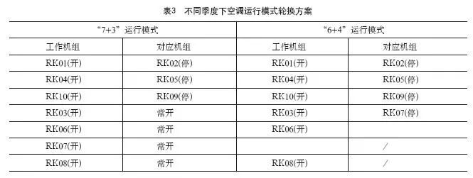 通過理論模擬與實際測量發(fā)現(xiàn):RK01與RK02,RK04與RK05,RK09與RK10可以形成互補工作機組,機組可以輪換工作;RK03、RK06、RK07、RK08無互補機組,實行24小時工作模式,制定了以周為單位進行輪換的機制。若四臺無互補機組的空調(diào)遇到檢修,則將其相鄰兩臺空調(diào)機組打開。具體如表3所示。