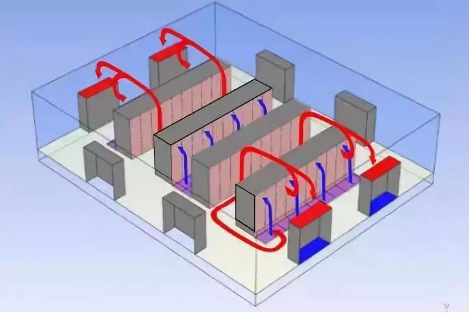 當(dāng)回風(fēng)的空氣到達(dá)排的末端時(shí),允許其恢復(fù)到冷卻單元的路徑,其中一些通常位于與排長(zhǎng)度平行的一邊。為防止氣流在運(yùn)輸過(guò)程中重新進(jìn)入冷通道,鉸鏈?zhǔn)讲糠謸醢逦挥诶渫ǖ赖哪┒。這些活動(dòng)擋板將IT設(shè)備屏蔽在排的最后一個(gè)機(jī)架的上部,以便在熱氣流經(jīng)過(guò)被吸走。