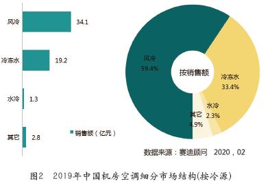 按照制冷冷源不同,機(jī)房空調(diào)可以分為風(fēng)冷型、水冷型和冷凍水型。隨著數(shù)據(jù)中心綠色節(jié)能、高密度、超大規(guī)模的發(fā)展趨勢,特別是大型互聯(lián)網(wǎng)企業(yè)的新建數(shù)據(jù)中心,傳統(tǒng)風(fēng)冷型制冷技術(shù)已經(jīng)無法滿足所需的散熱能力,冷凍水型制冷系統(tǒng)在高效制冷和大制冷量方面的優(yōu)勢,推動(dòng)了其較快推廣。據(jù)賽迪顧問統(tǒng)計(jì),從市場需求和銷售額來看,風(fēng)冷型制冷仍是目前機(jī)房空調(diào)中的主流機(jī)型,但冷凍水型制冷呈現(xiàn)較快增長趨勢。2019年,風(fēng)冷型機(jī)房空調(diào)市場銷售額達(dá)34.1億元,市場占有率為59.4%;冷凍水型機(jī)房空調(diào)市場銷售額達(dá)19.2億元,市場占有率為33.4%,見圖2。