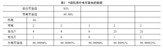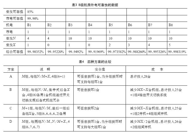 從字面上,不管N是6臺還是12臺還是18臺,后備1臺都可以視為滿足規(guī)范要求;但是有朋友按照空調(diào)末端冗余N+X,N>4常規(guī)備用2臺的實踐經(jīng)驗,覺得實際末端可靠性在90%,而實際柴發(fā)可靠性也約在80%~90%之間,覺得4臺以上也應(yīng)該備用2臺。表2和表3分別給出了柴發(fā)可靠性經(jīng)驗值為85%,市電可靠性經(jīng)驗值為99.90%時,A級機(jī)房和B級機(jī)房外電可靠性的數(shù)據(jù)。