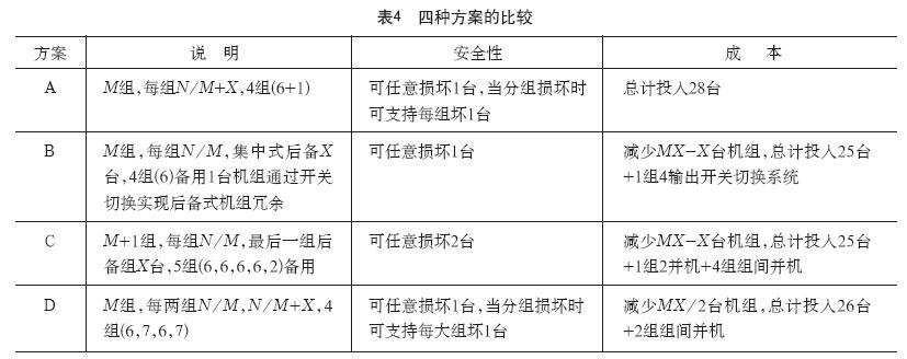在表4中,A屬于常見型,D屬于有案例,B、C均只屬于理論可行,其中B屬于硬件后備式冗余,C屬于軟件后備式冗余。C的備用組也可以僅設(shè)置1臺機(jī)組。當(dāng)項目規(guī)模較大,比如3萬機(jī)柜,18組每組6臺,可考慮設(shè)置一組備用6臺,直接進(jìn)行負(fù)載切換,而不需要組間并機(jī),可以視為C的一種變型。