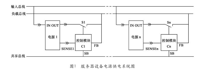 數(shù)據(jù)中心安裝的服務(wù)器設(shè)備中使用兩個(gè)或兩個(gè)以上的電源模塊同時(shí)為服務(wù)器負(fù)載供電,負(fù)載的總負(fù)荷不大于其中一半電源模塊的額定容量,一般把這種電源系統(tǒng)成為冗余電源系統(tǒng)。冗余電源系統(tǒng)多采用輸入總線、負(fù)載總線和共享總線的“三總線”的電路結(jié)構(gòu)。電源1、電源2…電源n為熱插拔電源模塊,它們以并聯(lián)方式相連接,C1、C2…Cn為各電源模塊的控制模塊,S1、S2…Sn為受控電流調(diào)節(jié)器/隔離器。具體供電結(jié)構(gòu)如圖1所示。