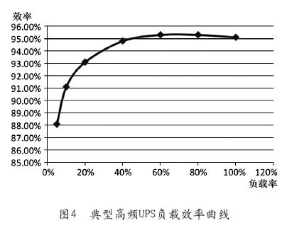 針對(duì)電源變換環(huán)節(jié),傳統(tǒng)數(shù)據(jù)中心采用UPS雙總線供電系統(tǒng),系統(tǒng)架構(gòu)參見(jiàn)圖3。每一路UPS系統(tǒng)均為并聯(lián)冗余系統(tǒng),在實(shí)際應(yīng)用中,UPS并機(jī)系統(tǒng)并機(jī)的臺(tái)數(shù)都不會(huì)太多,一般1+1并聯(lián)或者2+1并聯(lián)情況居多。并聯(lián)冗余系統(tǒng)中,在一臺(tái)UPS設(shè)備出現(xiàn)故障時(shí)系統(tǒng)依然能夠供電,這就要使得每臺(tái)UPS在平時(shí)的單機(jī)負(fù)載率保持較低的水平,如對(duì)于一套UPS(1+1)系統(tǒng)單機(jī)負(fù)荷載最大為50%,(2+1)UPS系統(tǒng)單機(jī)負(fù)載率最大為66%,如果再考慮到負(fù)載的可能突變,系統(tǒng)就必須要保持一定的余度,按系統(tǒng)80%的容量計(jì)算,實(shí)際上每臺(tái)UPS的單機(jī)負(fù)載率最大為40%(1+1系統(tǒng))~55%(2+1系統(tǒng))。參見(jiàn)圖4典型UPS負(fù)載效率曲線,UPS單機(jī)設(shè)備的最佳運(yùn)行效率多數(shù)在90%~94%左右,此時(shí)UPS設(shè)備負(fù)載率為40%~70%之間。供電系統(tǒng)實(shí)際運(yùn)行中,考慮到設(shè)備雙路電源均分負(fù)荷運(yùn)行方式,單機(jī)負(fù)載率區(qū)間為20%~40%,UPS設(shè)備運(yùn)行效率多在80%~90%間。