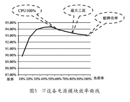 從圖5中可以注意到服務(wù)器最大工況是銘牌額定值的80%,這是因?yàn)榉⻊?wù)器廠家在選擇電源模塊時(shí)考慮20%的功率富余。而典型工況大概是銘牌額定值的67%。事實(shí)上服務(wù)器正常工作時(shí)的功耗小于典型工況。參見(jiàn)圖5,以電源模塊負(fù)載率50%為對(duì)稱軸,負(fù)載率高于50%時(shí),效率值略有下降,但高于對(duì)稱負(fù)載率低于50%處。假定電源模塊損耗可分為固定的空載損耗和可變的負(fù)載損耗,根據(jù)實(shí)際測(cè)試數(shù)據(jù),空載損耗可控制不高于銘牌額定值的1.5%左右;谝陨先齻(gè)因素,IT設(shè)備雙路電源模塊選在主備模式時(shí)(主用模塊負(fù)擔(dān)100%,熱備模塊負(fù)擔(dān)0%),整體工作效率處于最佳狀態(tài)。