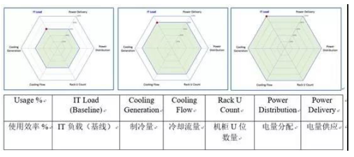 完美使用模式——資源使用率與IT負(fù)載率匹配(來源:綠色網(wǎng)格)。當(dāng)IT負(fù)載率(與設(shè)計(jì)量的比值)達(dá)到相應(yīng)的級別,其他如供電、冷量等也占用相同的比值。最完美的使用模式是當(dāng)IT負(fù)載率達(dá)到100%時(shí),電量供應(yīng)和制冷量資源使用率趨近100%