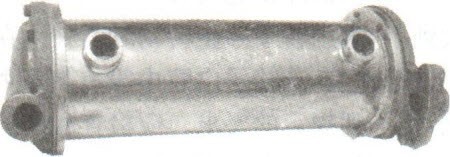 水冷式潤滑油冷卻裝置的實(shí)物外形及零件分解如圖6-36和圖6-37所示。它主要由芯子和殼體組成。芯子由黃銅管、散熱片和隔片組成。潤滑油在芯子與殼體的夾層之間流動(dòng)。冷卻液在芯子內(nèi)部流動(dòng)時(shí),帶走潤滑油的部分熱量。經(jīng)過冷卻液的循環(huán)往復(fù)流動(dòng),使油溫控制在80·C±5·C范圍內(nèi)。