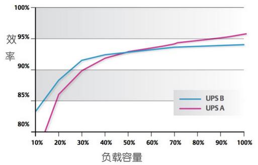 為了更清楚的加以說明,廣大讀者不妨考慮兩款不同的UPS系統(tǒng)的效率曲線(如圖1所示)。A款UPS的額定效率為96%,而B款UPS的 額定效率則為94%。