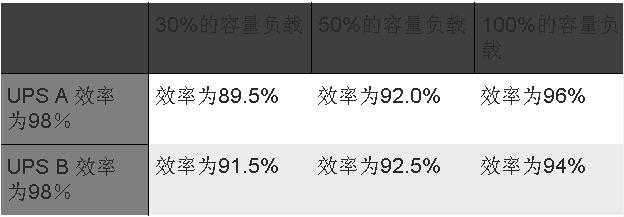 當在對比選擇決定兩款UPS中的哪款更更有效時,滿負載容量情況下,效率為96%的UPS A將是合乎邏輯的選擇;但當在不同的操作容量能力情況下進行對比時(如下表2),結果便出現(xiàn)了大反轉。在容量能力低于50%的情況下,“效率較低”的UPS的實際效率要比效率為96%的UPS更高效。