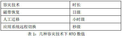 RTO(RecoveryTimeObjective,復(fù)原時(shí)間目標(biāo))是數(shù)據(jù)中心可容許服務(wù)中斷的時(shí)間長(zhǎng)度。比如說(shuō)服務(wù)發(fā)生后半天內(nèi)便需要恢復(fù),RTO數(shù)值就是十二小時(shí)。RTO具體時(shí)間長(zhǎng)短只是從故障發(fā)生后,從數(shù)據(jù)中心系統(tǒng)宕機(jī)導(dǎo)致應(yīng)用停頓之刻開(kāi)始,到數(shù)據(jù)中心系統(tǒng)恢復(fù)至可以支持各部門運(yùn)作之時(shí),此兩點(diǎn)之間的時(shí)間段。RTO是反映數(shù)據(jù)中心業(yè)務(wù)恢復(fù)的及時(shí)性指標(biāo),表示業(yè)務(wù)從中斷到恢復(fù)正常所需的時(shí)間,RTO數(shù)值越小,代表容災(zāi)系統(tǒng)的數(shù)據(jù)恢復(fù)能力越強(qiáng),數(shù)據(jù)中心可以部署很多容災(zāi)系統(tǒng),來(lái)獲取最小的RTO,但這意味著投入大量資金。提升RTO的常用技術(shù)有:磁帶恢復(fù)、人工遷移、應(yīng)用系統(tǒng)遠(yuǎn)程切換,這幾種技術(shù)的RTO的表現(xiàn)如表1所示: