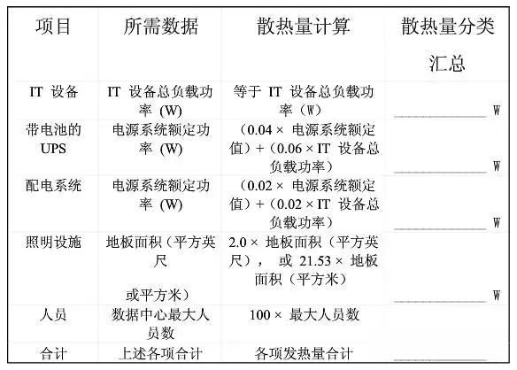 表1為快速計(jì)算熱量負(fù)荷數(shù)據(jù)表。使用該數(shù)據(jù)表,可以迅速可靠地確定數(shù)據(jù)中心的總的熱負(fù)荷。該數(shù)據(jù)表的使用方法見(jiàn)表1后的計(jì)算步驟。