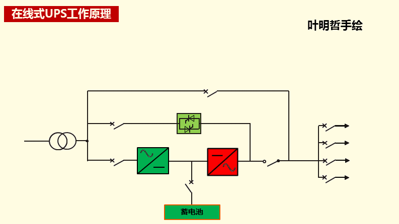 工作原理:無論市電是否正常,均由逆變器經相應的靜態(tài)開關向負載供電。市電正常時,整流器向逆變器供給直流電,并對蓄電池組補充充電;當市電異常時,蓄電池組放電向逆變器供給直流電。