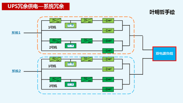 常見的是雙總線系統(tǒng),系統(tǒng)內部設備獨立,配電系統(tǒng)獨立,是目前業(yè)內公認的最可靠及可行的工作方式,冗余方式發(fā)揮作用前提是負載設備配備雙電源模塊,且兩個電源模塊式負載分擔模式工作,該方法也被普遍采用。