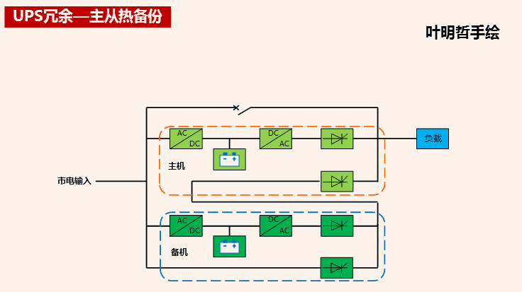 正常情況下主機(jī)帶載,從機(jī)空載,負(fù)荷不均分;主從機(jī)之間互換較困難,從機(jī)電池長(zhǎng)期空載,設(shè)備老化不一致;從機(jī)需要有帶階躍性負(fù)載的能力,否則會(huì)出現(xiàn)主機(jī)切從機(jī),從機(jī)切旁路情況;該方法目前基本不再使用。